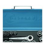 O estojo metálico com pintura eletrostática na cor azul proporciona organização e proteção para as ferramentas, facilitando o transporte e armazenamento. A catraca reversível de 270mm e os acessórios como extensões e junta universal, otimizam o trabalho em locais de difícil acesso.