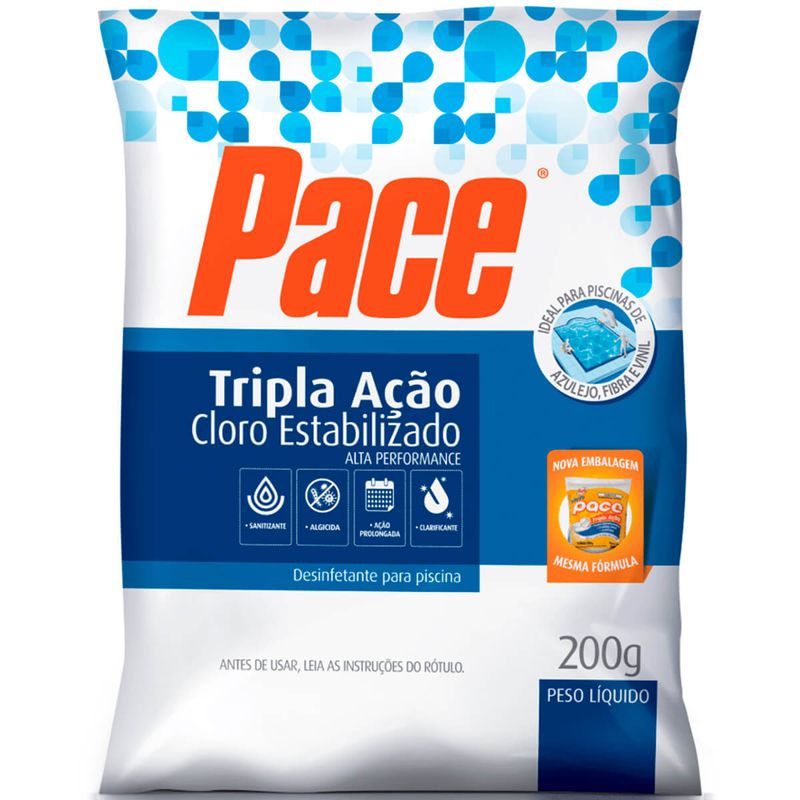 Por causa de sua lenta dissolução e do ácido cianúrico em sua composição, o Pace Tripla Ação mantêm o efeito sanitizante do Cloro por mais tempo na água da piscina, sendo indicado como um ótimo auxiliar no tratamento habitual em conjunto com o cloro granulado. Com sua ação prolongada, proporciona a conveniência da proteção da água sem a necessidade do controle diário e sem arriscar a saúde de sua família.