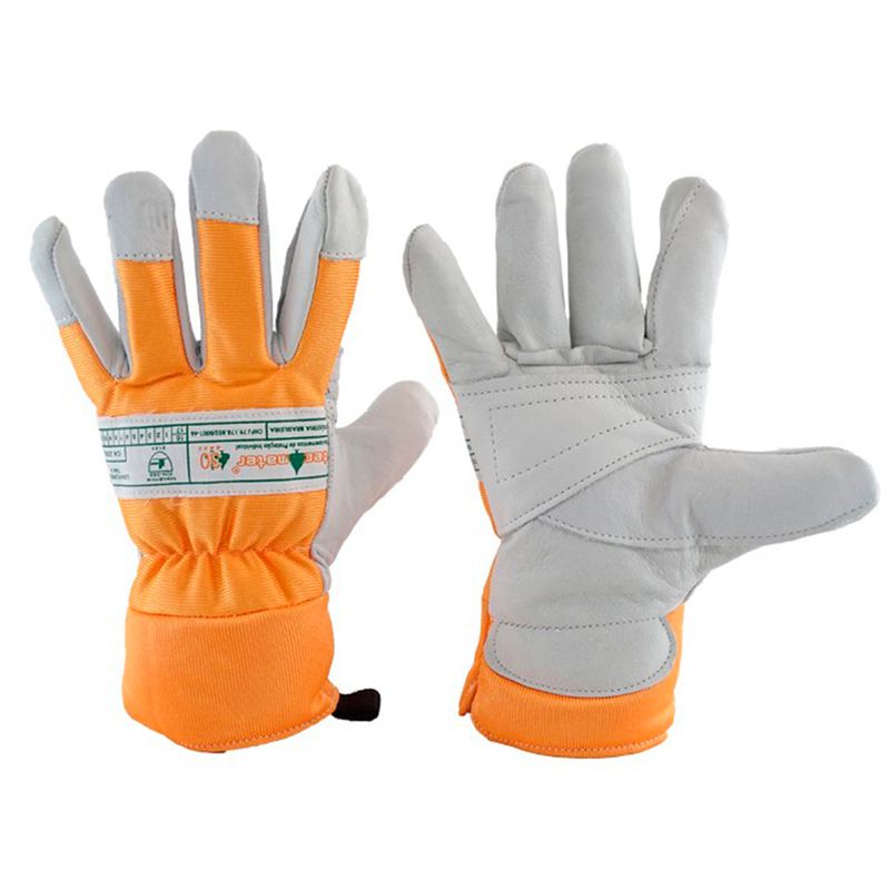 A Luva de Couro Vaqueta/Nylon Tecmater é confeccionada em couro bovino tipo vaqueta na palma, face palmar dos dedos, pontas dos dedos e dedo polegar, dorso em material têxtil tipo nylon de cor laranja com ajuste em elástico. Reforço em couro vaqueta na palma e entre os dedos indicador e polegar, punho em material têxtil idêntico ao dorso com protetor de artéria em vaqueta, costuras realizadas com linha nylon.