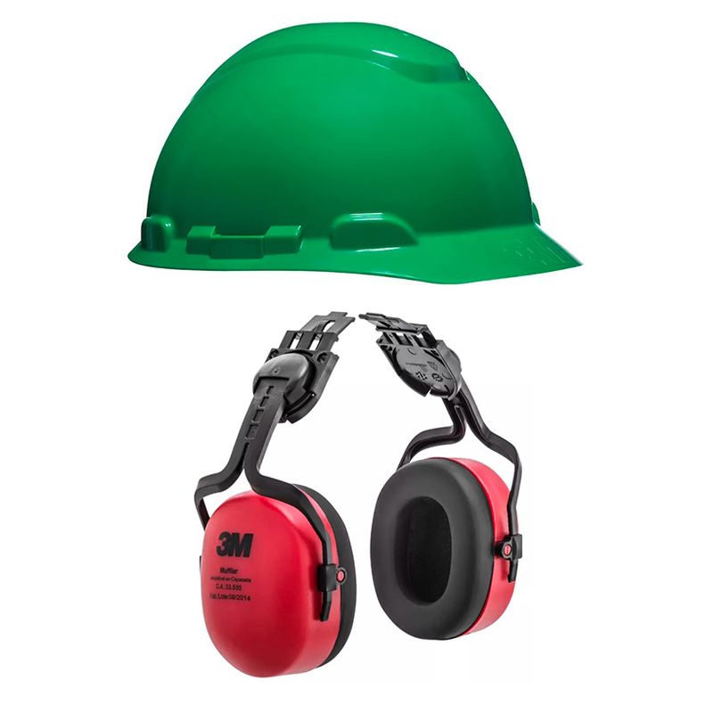 Kit Abafador De Ruído 3M Muffler 18Db e Capacete De Segurança 3M H-700 Aba Frontal E Jugular Verde