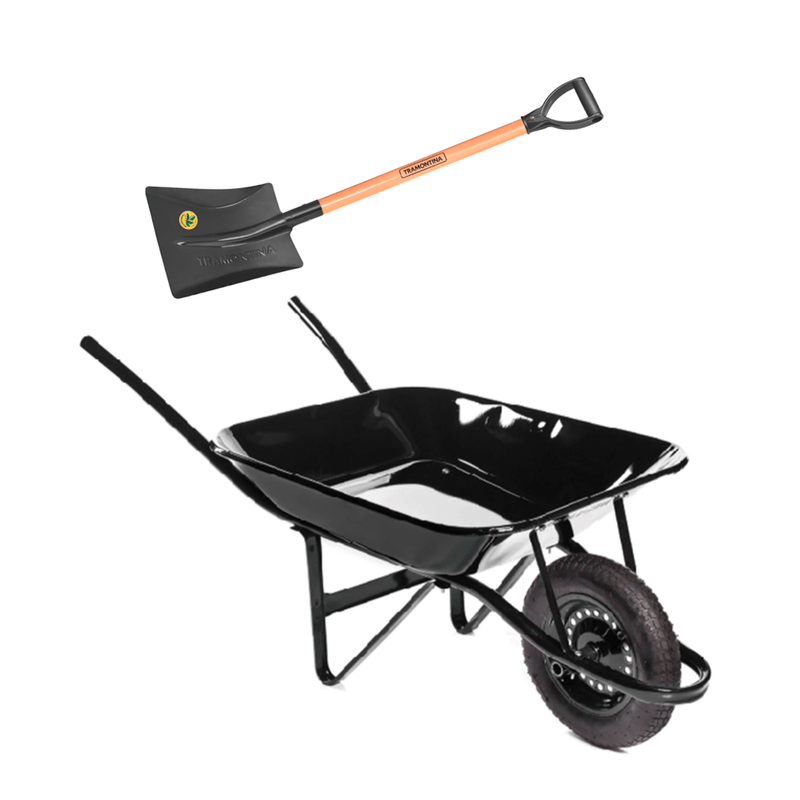 Kit Carrinho De Mão Metalpama Preto 60 Litros + Pá Quadrada Tramontina