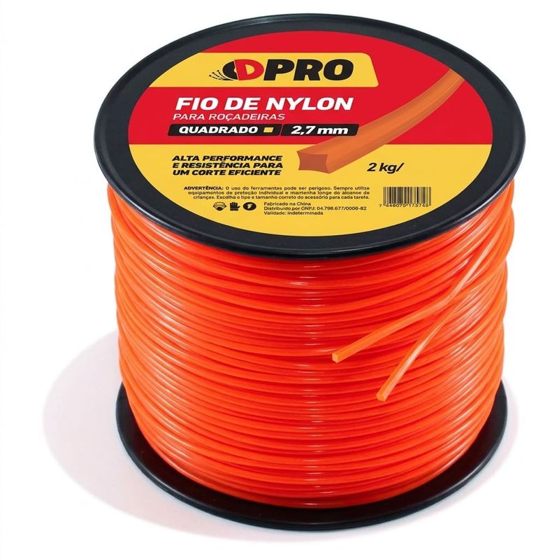 Para paisagistas profissionais, equipes de manutenção de rodovias, agricultores, zeladores de grandes áreas e proprietários de sítios que enfrentam mato alto, ervas daninhas resistentes e vegetação densa, a Bobina de Fio de Nylon 2.7mm Quadrado DPRO é a ferramenta de elite. Com seu perfil quadrado e espessura robusta, este fio foi projetado para \"fatiar\" a vegetação com uma agressividade que os fios redondos não conseguem alcançar. Não deixe que a vegetação densa atrase seu cronograma! Suba para a potência do perfil quadrado laranja DPRO e sinta a autoridade de um corte limpo, rápido e extremamente resistente em cada passada da sua roçadeira.