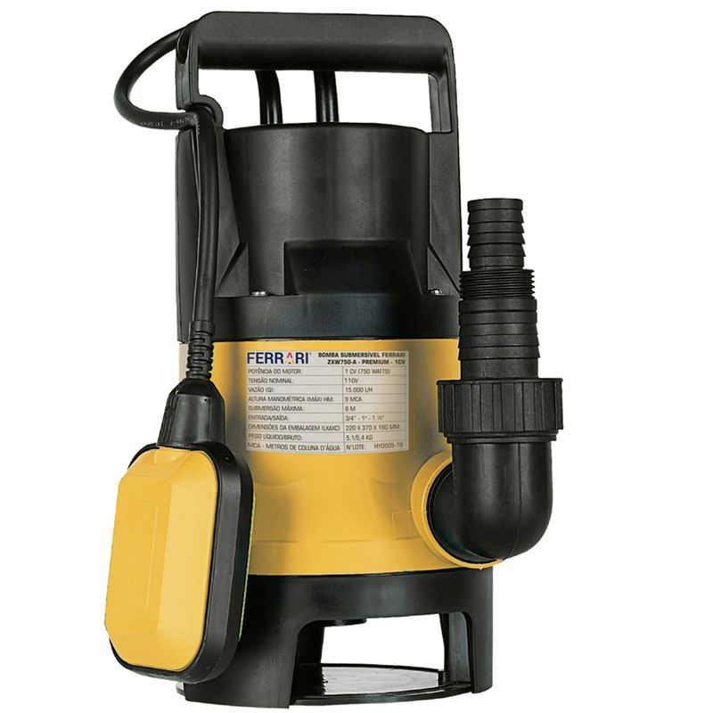 A Bomba submersa 750 watts para "água suja" ZXW750-A da Ferrari apresenta sensor de nível automático integrado que assume automaticamente o liga/desliga do equipamento e é ideal para esgotamento, drenagem ou transferência de água suja em porões e reservatórios, podendo trabalhar com líquidos com partículas sólidas de até 35 mm de diâmetro. Motor classificado com grau IP-68 de proteção e com um baixo nível de ruído