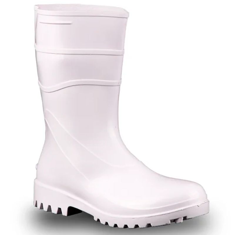 Bota Ocupacional Impermeável confeccionada em policloreto de Vinila (PVC), com solado com ranhura no salto, fácil limpeza e que retarda a passagem de temperatura, altamente resistente a bactérias, ambientes refrigerados, ácidos, óleos e solventes, com estrias laterais que facilitam o calçar
