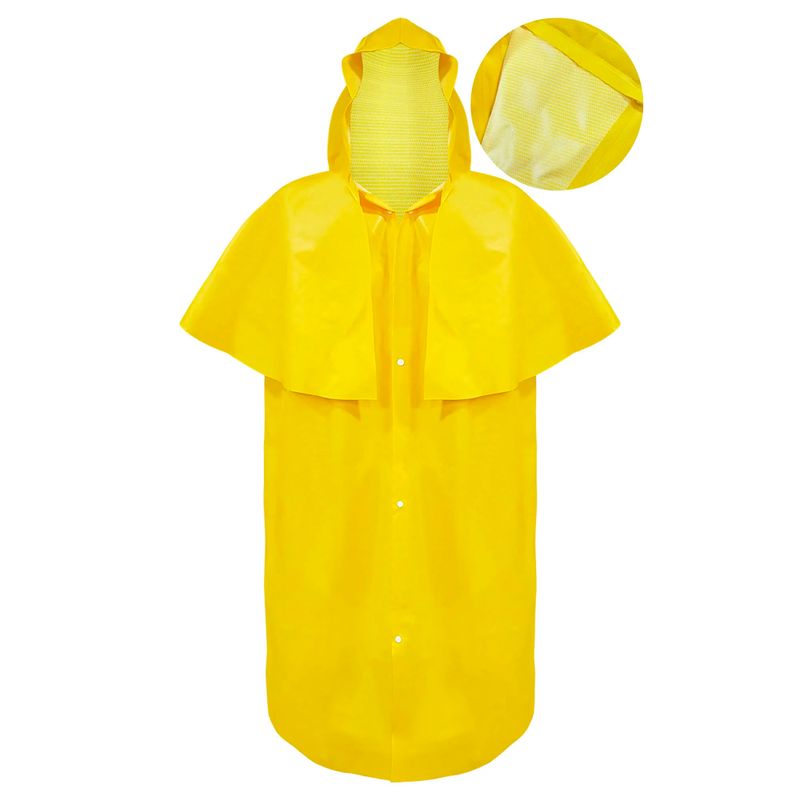 A Capa de Chuva Caperê PVC Forrada Com Manga Morcego é confeccionada em tecido sintético na cor amarela, revestido com PVC, com manga morcego, fechamento frontal através de botões de pressão, costuras por meio de solda eletrônica.