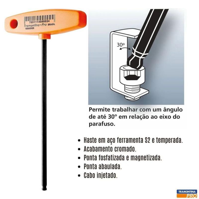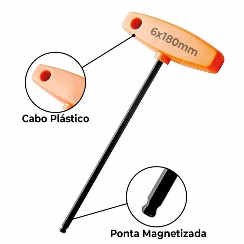 Possui haste em aço ferramenta S2 e temperada, garantindo alta resistência e durabilidade para uso intenso. Seu cabo tipo T injetado em plástico proporciona maior conforto e permite a aplicação de torque elevado em parafusos com sextavado interno.