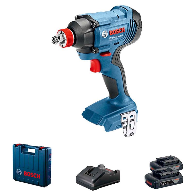 A Chave de Impacto Bosch GDX 180-LI 2X1,5 AH, possui exclusivo sistema Bosch com mandril 2 em 1: 1/4" hexagonal e 1/2" quadrado. Sistema de proteção da bateria protege as células evitando superaquecimento par para maior vida útil e proteção eletrônica do motor evita que ele queime, garantindo maior durabilidade da sua ferramenta