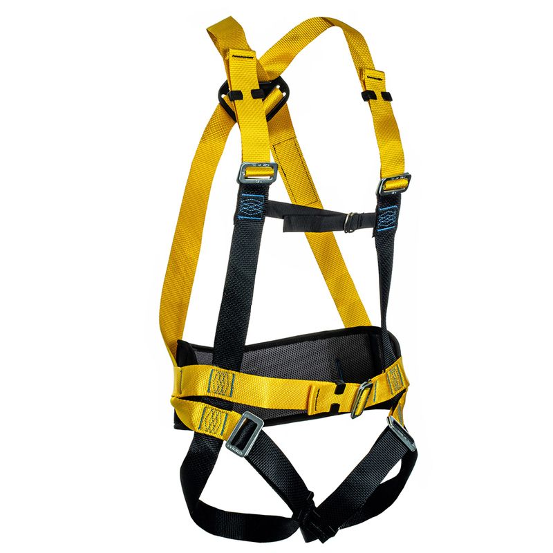 Cinturão de segurança do tipo paraquedista com 2 pontos de conexão, com abdominal integrado e fivelas duplas de aço para ajustes nas pernas, suspensórios e cintura