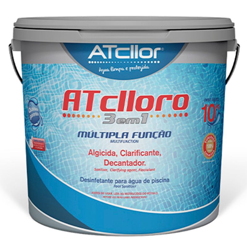 Cloro Atclloro apresenta 3 funções em um só produto: desinfeta, clarifica e decanta, atingindo o resultado esperado com um prático tratamento, reduz a mão de obra empregada nos tratamentos convencionais