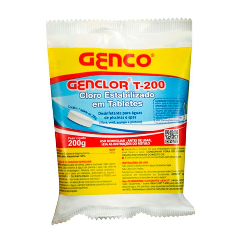 O Cloro para Piscina Genco T-200 em tabletes concentrados com 90% de cloro ativo, possui estabilizante que inibem a degradação do cloro pelos raios UV e apresenta dissolução lenta para cloração contínua e automática em cloradores ou dosadores automáticos por vários dias.