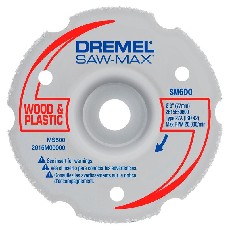 O Disco de Corte Dremel Saw Max SM600 conta com 80 mm de diâmetro sendo composto de carbeto de tungstênio e ideal para cortes rentes em batente de portas e rodapés e cortes chanfrados.
