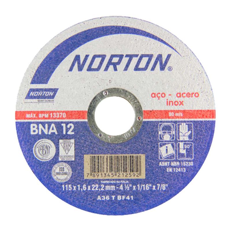O Disco de Corte Norton BNA 12 para Inox 4.1/2 Polegadas é indicado para cortes e desbastes em geral e manutenções industriais, por ser um disco de alta resistência e excelente custo-benefício tamanho de 4.1/2 polegadas, 1 de espessura e 7/8 furo