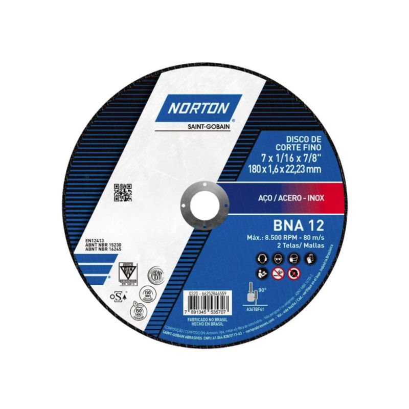 O Disco de Corte Norton BNA 12 para Inox 7 Polegadas é indicado para serralheiros e demais profissionais em geral, para cortes de barras, tubos, chapas metálicas, aço carbono e aço inox. É ideal para operações de corte que necessitam excelente acabamento com corte fino