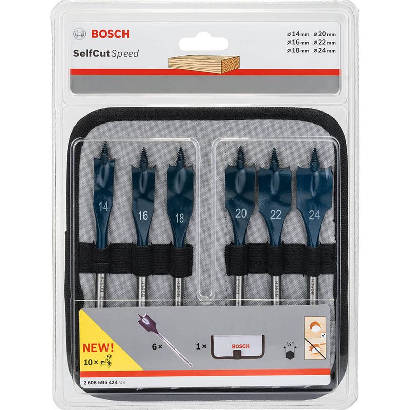 Jogo com 6 Brocas Bosch para Madeira Chata é composto por 6 Brocas para Madeira Chata Self Cut Speed - diâmetros: 14,0/16,0/18,0/20,0/22,0/24,0mm (encaixe hexagonal 1/4")