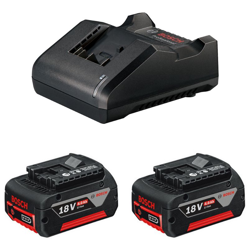 Kit com Carregador de Baterias Bivolt GAL 18V-20 e 2 baterias Bosch 18V 4,0Ah, é 100% compatível com ferramentas 18V Bosch. Indicado para uso industrial contando com 2 anos de garantia Bosch. Confira!