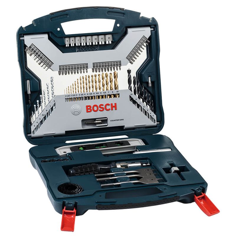 O Kit bosch possui um variado portfólio de brocas com diferentes diâmetros, sendo as de aço rápido em titânio para aplicações em metal, brocas com ponta de metal duro para perfurações em alvenaria, brocas de três pontas para madeira e as brocas planas em titânio que permitem perfurações em maiores diâmetros nos diferentes tipos de madeira