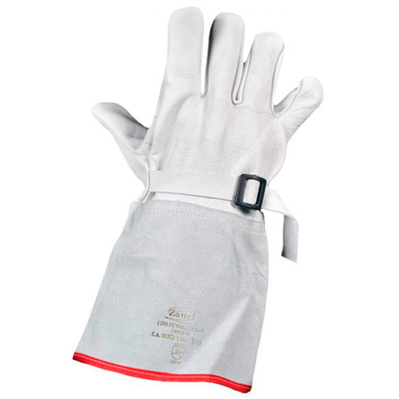 A Luva de Cobertura Zanel para Eletricista é indicada para apoio à área elétrica, confeccionada em couro bovino curtido ao cromo e vaqueta, com palma, dorso e dedos em vaqueta, com punho de raspa, acabamento em viés vermelho, tira para regulagem no dorso com espessura média da raspa em 1,50 mm e espessura média da vaqueta em 1,10 mm, com gramatura 0,0815 gramas/cm² ou 0,815 kg/m² e gramatura 0,0580 gramas/cm² ou 0,580 kg/m², costurada com algodão ou Kevlar