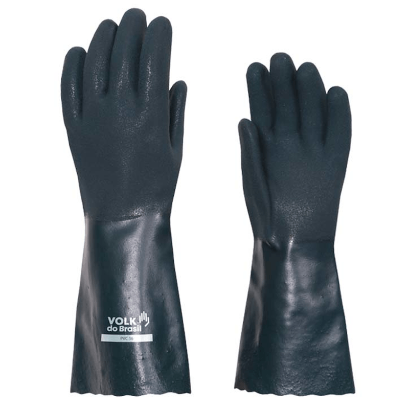 A Luva de PVC Volk 36 cm Verde é confeccionada em suporte têxtil de algodão, revestimento externo em policloreto de vinila (PVC) e acabamento antiderrapante tipo areia, na região palmar, ponta dos dedos e dorso.