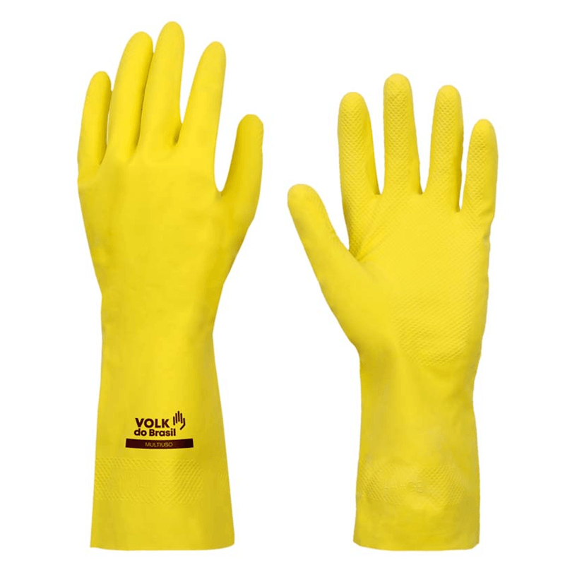 A Luva Látex Volk Multiuso Amarela é confeccionada em borracha natural, revestida internamente com flocos de algodão, antiderrapante na face palmar e nos dedos, lisa na face dorsal e punho