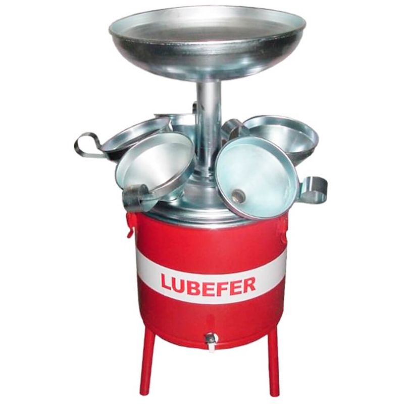 A Pingadeira de Óleo Lubefer conta com reservatório de 25 litros com pintura eletrostática (EPOX), estante pingadeira com tripé e orifícios porta-funis, bandeja sem regulagem de altura e torneira para esgotamento.