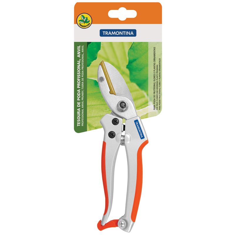 A Tesoura Tramontina Tipo Anvil é ideal para poda de frutíferas, flores e plantas ornamentais. Indicado para galhos secos e duros. Leve, proporcionando uma agilidade melhor durante o uso, conta com lâminas em aço alto carbono temperado, garantindo maior durabilidade do fio e um corte mais preciso e macio, cabo ergonômico, batente emborrachado amortecendo o impacto de fechamento das lâminas e trava de Segurança para fechamento das lâminas quando não estão em uso.