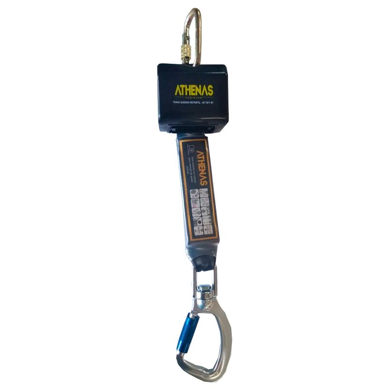 O Trava Quedas Retrátil Athenas é ideal para retenção de queda durante movimentação horizontal e vertical. Em fita de poliéster com 2,5 metros de comprimento, mecanismo interno em aço carbono revestido de polímero, absorvedor de energia, conector alumínio giratório 360°, classe "T", dupla trava e conector aço classe "B" com trava simples de rosca